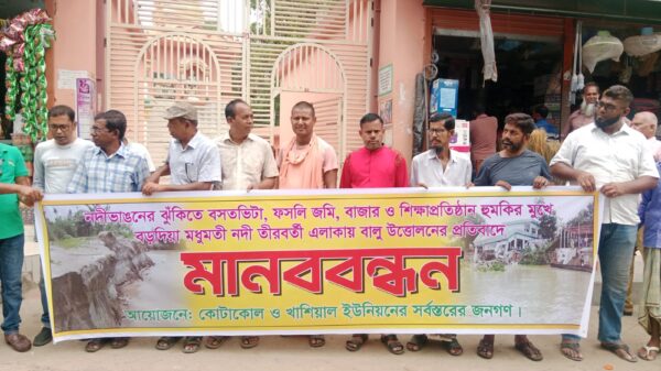 ডেস্ক নিউজঃ নড়াইলের বড়দিয়ায় নদীভাঙনের ঝুঁকিতে বসতভিটা, ফসলি জমি, বাজার ও শিক্ষাপ্রতিষ্ঠান হুমকির মুখে থাকায় বড়দিয়া সংলগ্ন মধুমতী নদী তীরবর্তী এলাকায় বালু উত্তোলন বন্ধের প্রতিবাদে মানববন্ধন করেছে কোটাকোল ও খাশিয়াল ইউনিয়নের সর্বস্তরের জনগণ। ১৪ এপ্রিল (মঙ্গলবার) সকাল সাড়ে ১১ টায় read more