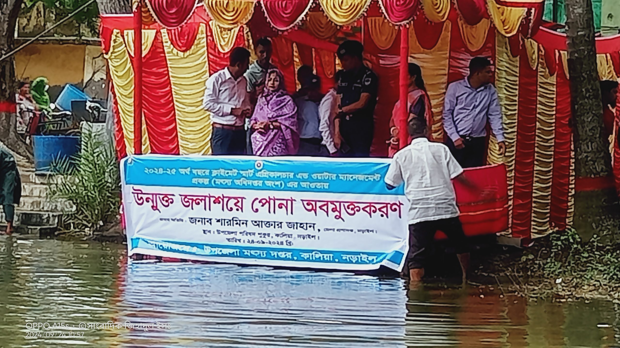 নড়াইলের কালিয়ায় ২০২৪-২৫ অর্থ বছরে ক্লাইমেট স্মার্ট এগ্রিকালচার এন্ড ম্যানেজমেন্ট প্রকল্প (মৎস্য অধিদপ্তর অংশ) এর আওতায় উন্মুক্ত জলাশয়ে পোনা অবমুক্তকরণ করা হয়েছে। ২৪ সেপ্টেম্বর (মঙ্গলবার) সকাল ১১ টায় কালিয়া উপজেলা মৎস্য অফিসের আয়োজনে উপজেলার ২১ টি জলাশয়ে এ মৎস্য পোনা অবমুক্ত করেন জেলা প্রশাসক শারমিন আক্তার জাহান। এ সময় উপস্থিত ছিলেন, ইউএনও কালিয়া রাশেদুজ্জামান, উপজেলা সহকারী কমিশনার (ভূমি) আব্দুল্লাহ আল মামুন, উপজেলা মৎস্য অফিসার আবু রায়হান, উপজেলা বিএনপির আহ্বায়ক সরদার আনোয়ার হোসেনসহ আরো অনেকে।