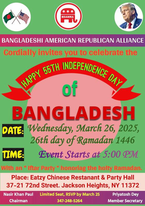 বাংলাদেশী-আমেরিকান রিপাবলিকান এলায়েন্সের এর ঊদ্যোগে মহান স্বাধীনতা দিবসের ৫৪তম বার্ষিকী যথাযোগ্য মর্যাদায় আজ ২৬ মার্চ ২০২৫, বুধবার,বিকাল ৫টায় নিউইয়র্কের ৩৭-২১,৭২ষটী জ্যাকসন হাইটস এর ইটজি পার্টি হনে পালন উপলক্ষে এক আলোচনা সভা,দোয়া মাহফিল ও ইফতার পার্টি আয়োজন করা হয়েছে ।এতে সবাইকে সংগঠনের পক্ষ থেকে আমন্ত্রণ জানিয়েছেন সংগঠনের চেয়ারম্যান ও বিশিষ্ট রিয়েলেটর নাসির আলী খান পল ও সদস্য সচিব প্রিয়তোস দে ।
