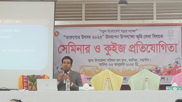 ডেস্ক নিউজঃ নড়াইলের কালিয়ায় তারুণ্যের উৎসব ২০২৫ উদযাপন উপলক্ষ্যে ভুমি সেবা বিষয়ক সেমিনার ও কুইজ প্রতিযোগিতা অনুষ্ঠিত হয়েছে। ২৩ জানুয়ারী উপজেলা ভুমি অফিসের ( বৃহস্পতিবার) সকাল সাড়ে ১১ টায় উপজেলা